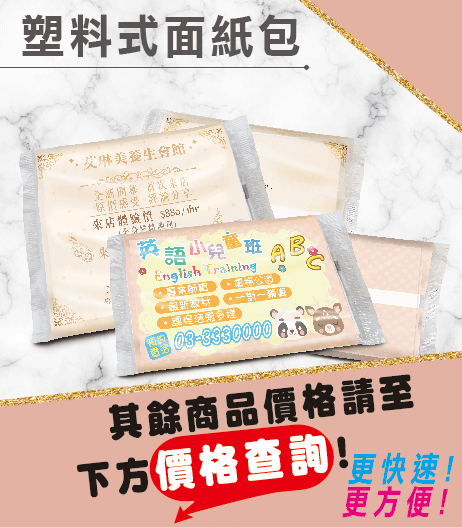 2.袖珍塑料面紙包(含白墨):先在外層膠膜上白墨後,再將廣告內容直接印製於外層膠膜,